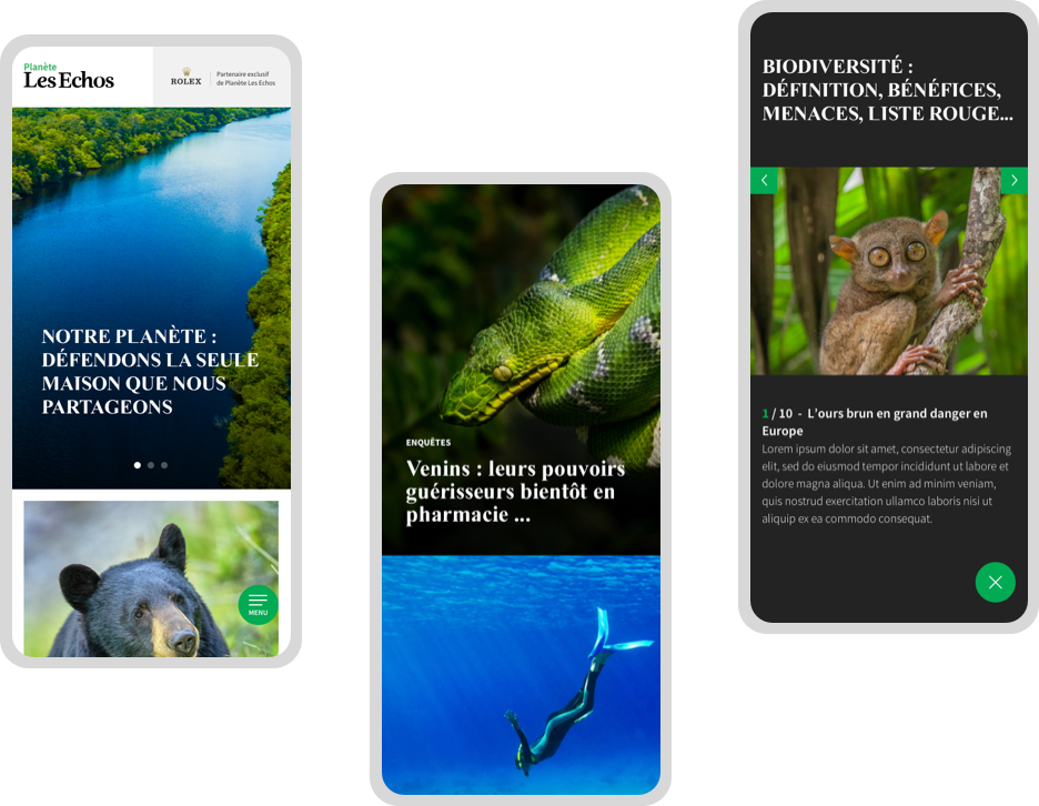 Réalisation du site les Echos Planète qui a pour ambition d’aller un cran plus loin en montrant par l’exemple que des solutions existent ainsi que des esprits pionniers pour inventer une nouvelle économie résolument plus respectueuse de l’environnement.